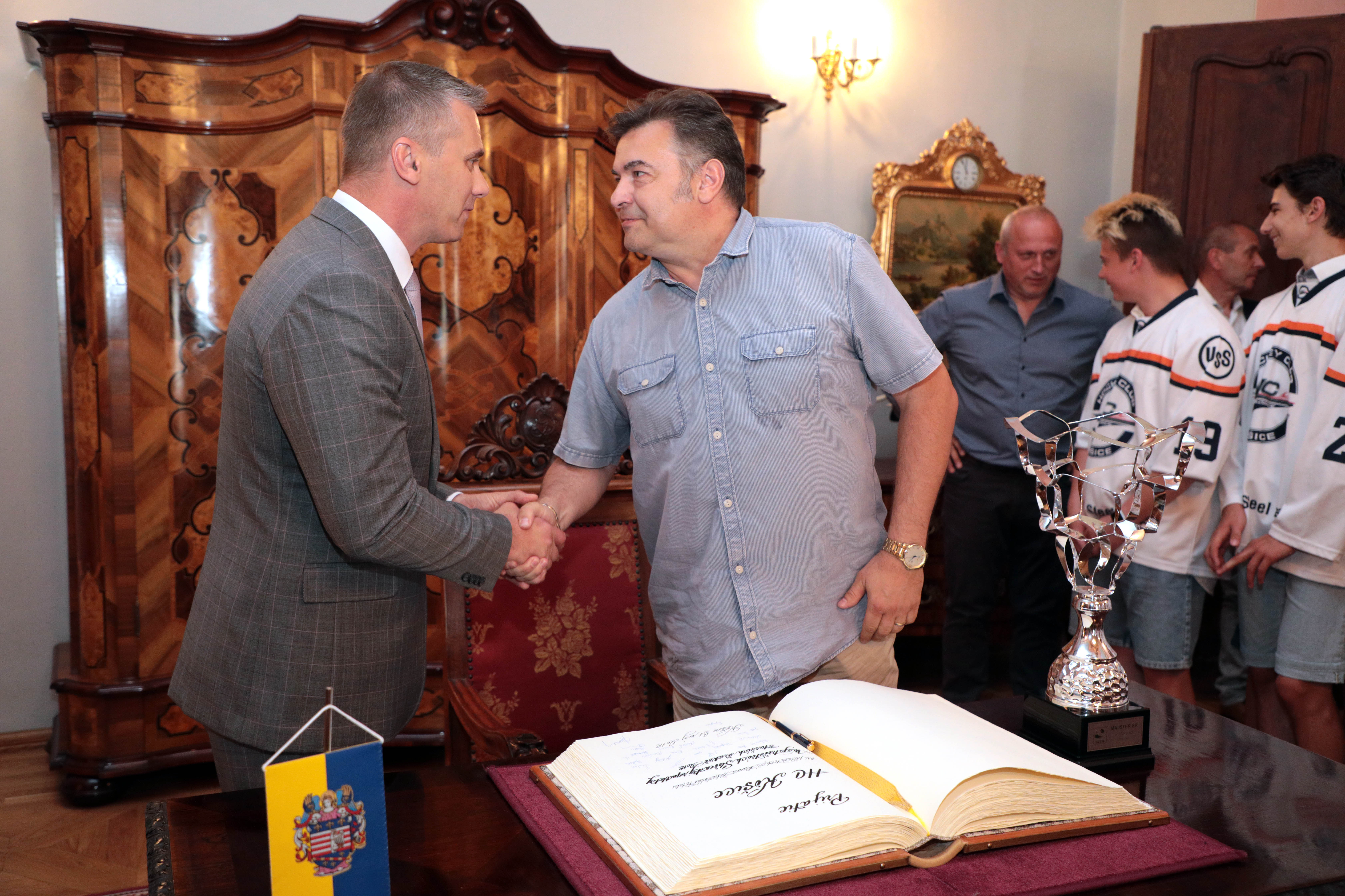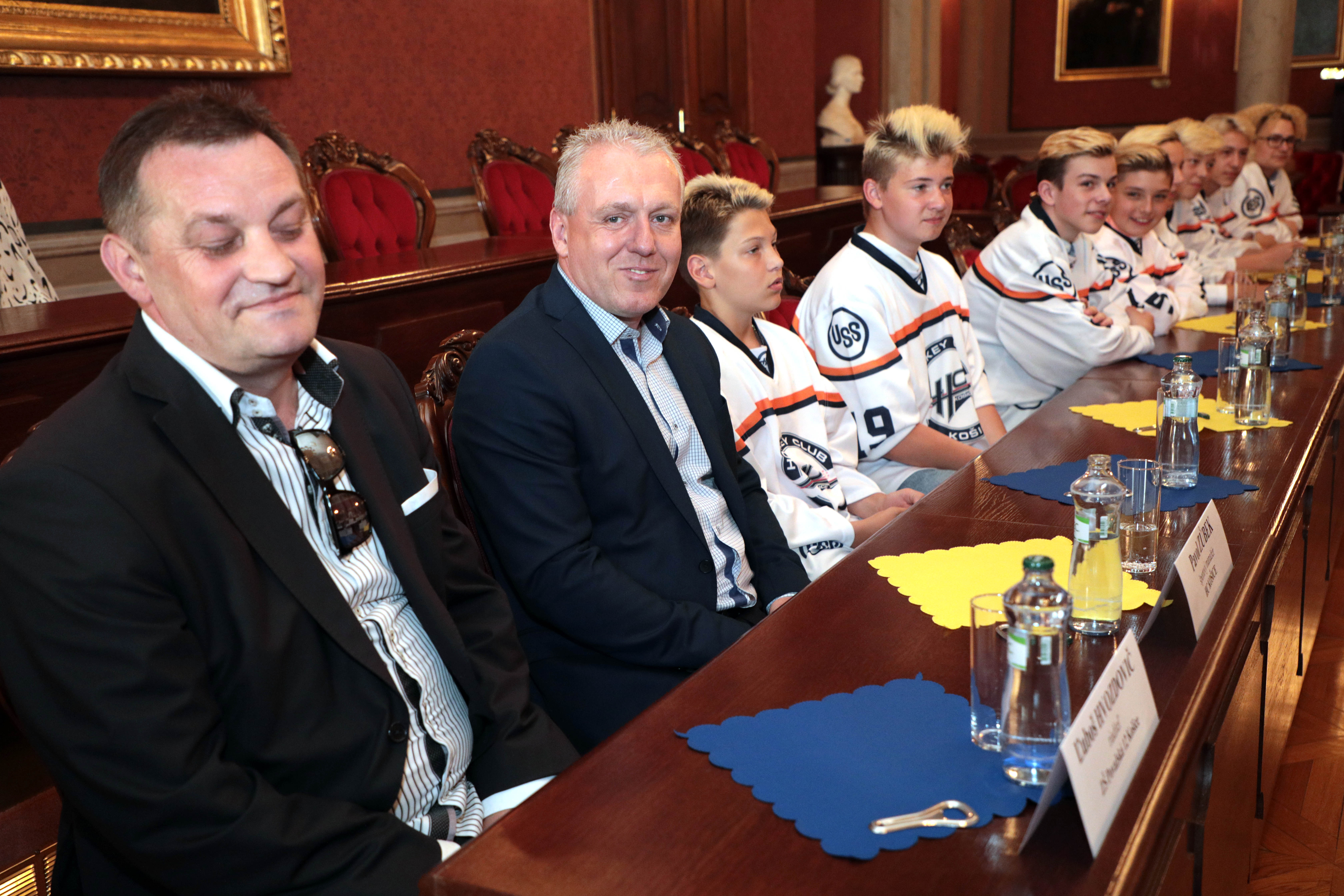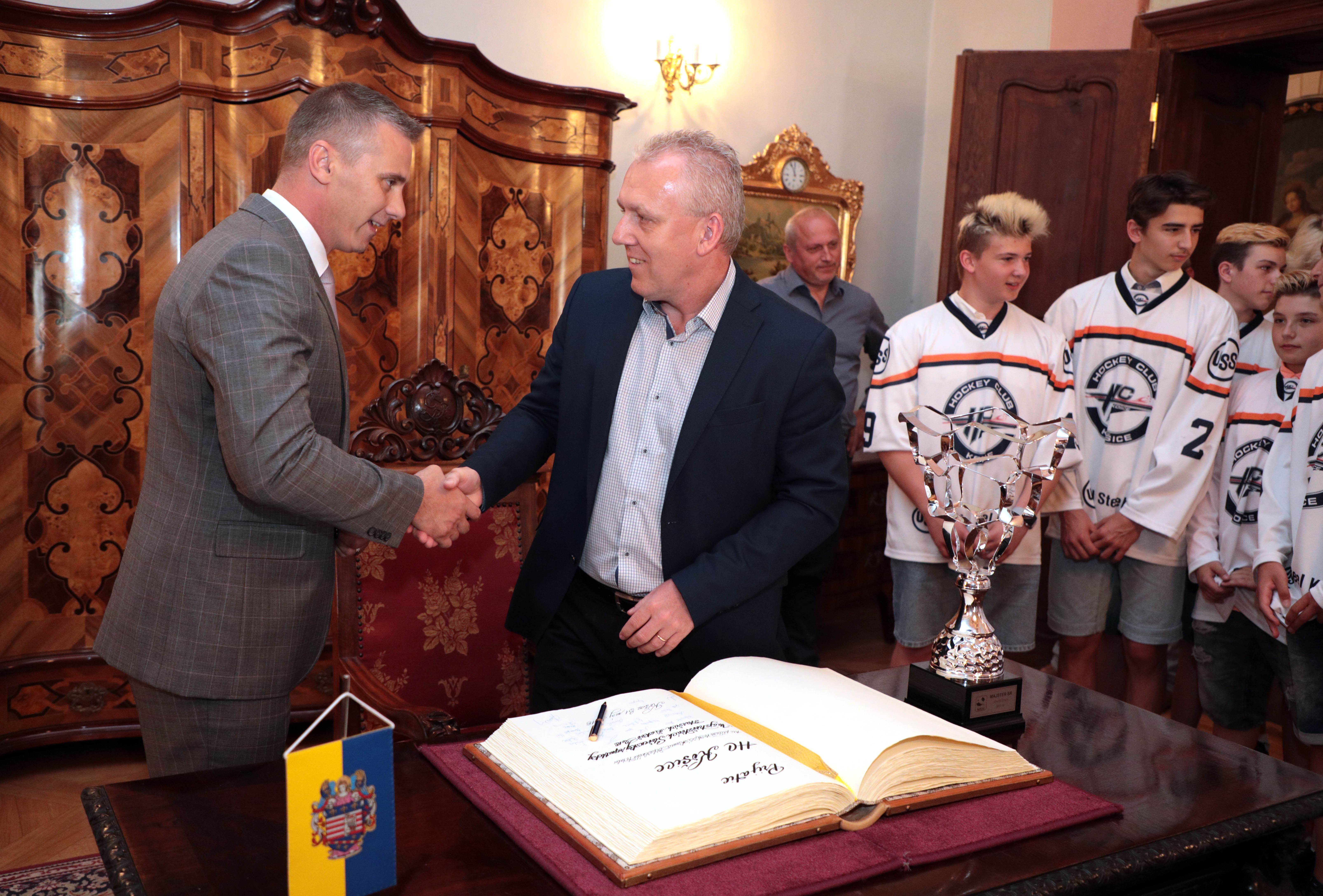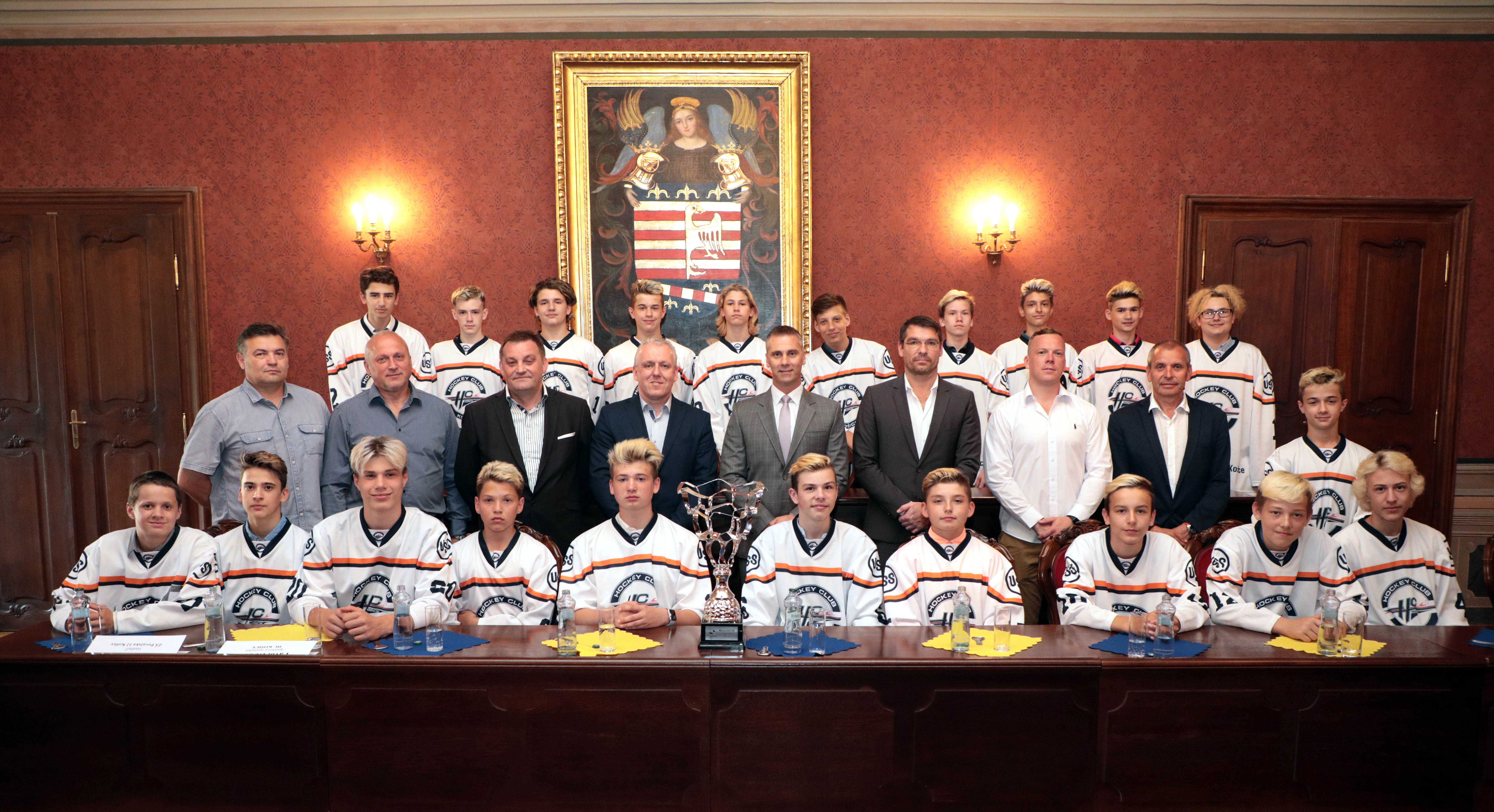 Našich starších žiakov, ktorí získali titul majstra Slovenska, dnes prijali predstavitelia mesta. Stalo sa tak na košickej radnici, kde ich privítal námestník primátora Martin Petruško, vedúci referátu športu a mládeže mestského magistrátu Ivan Šulek a vedúci kancelárie primátora a člen správnej rady HC Košice Martin Petruš.