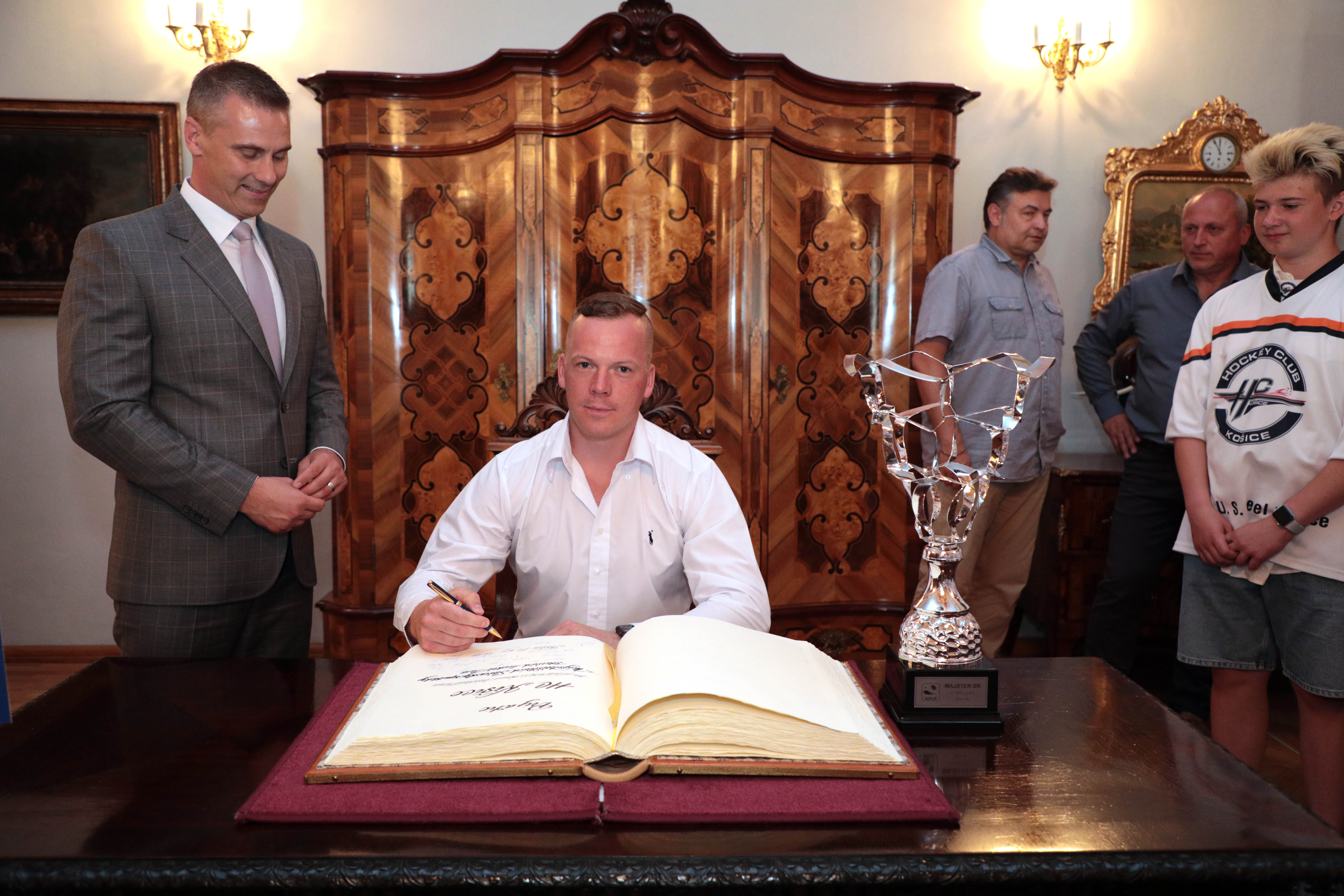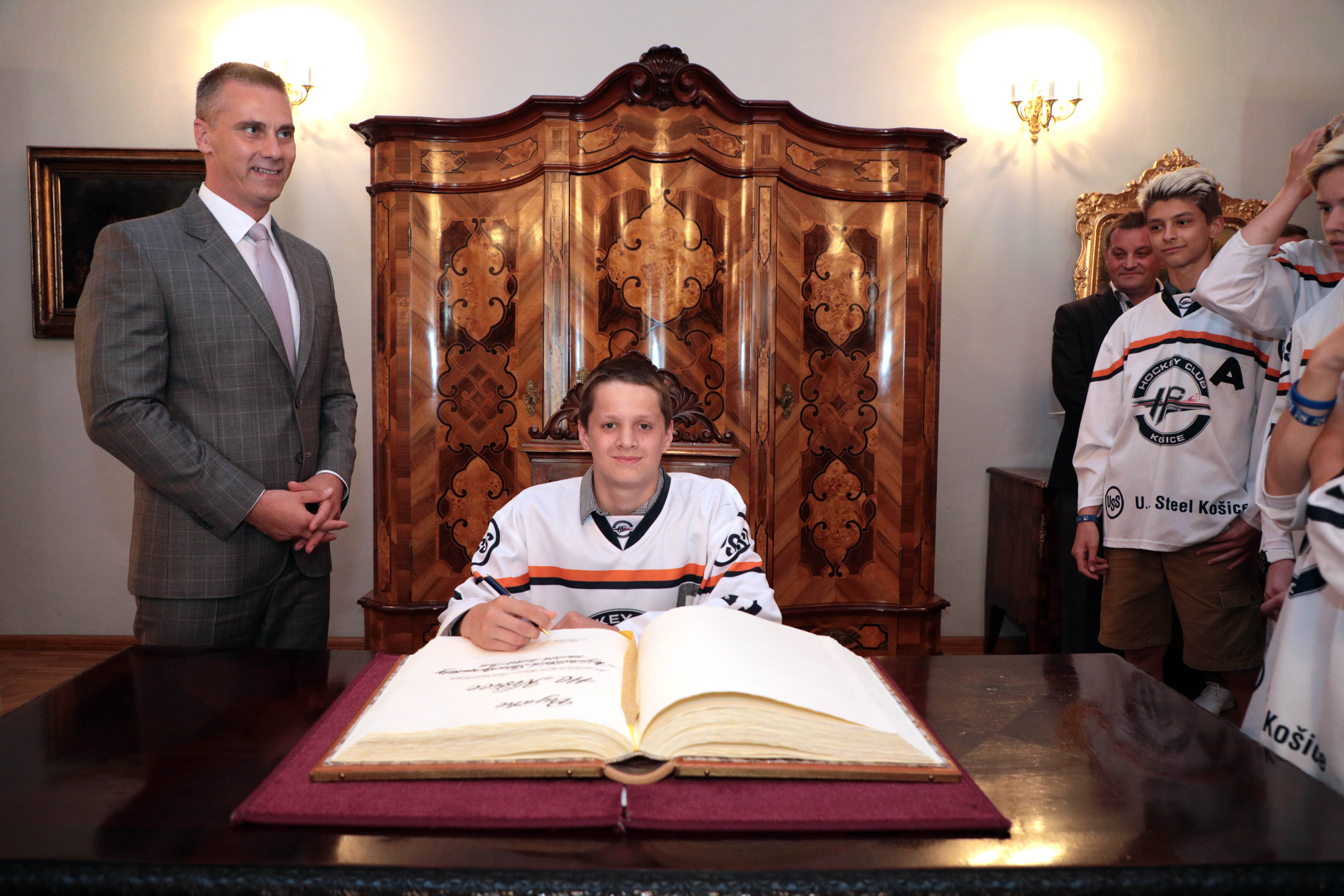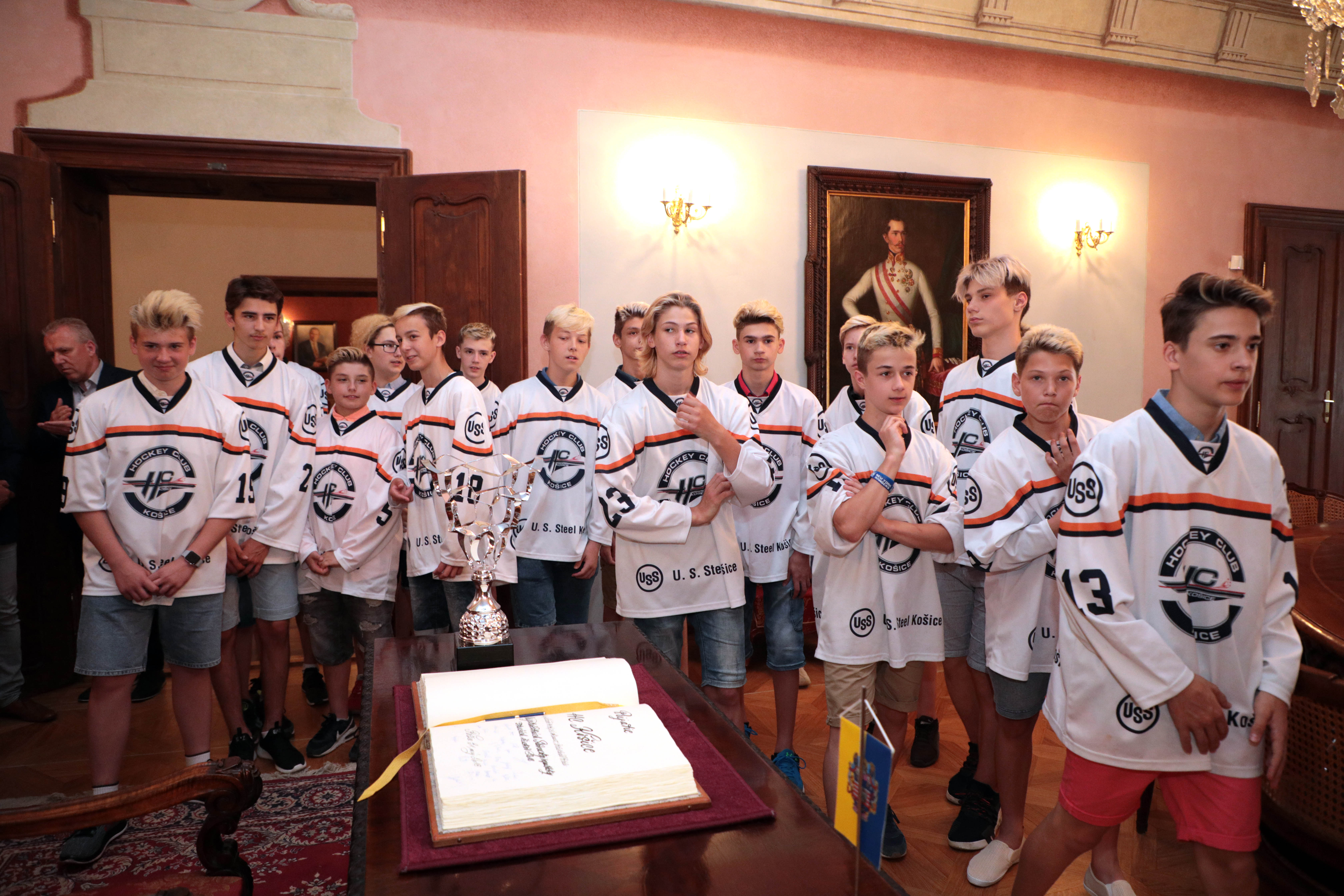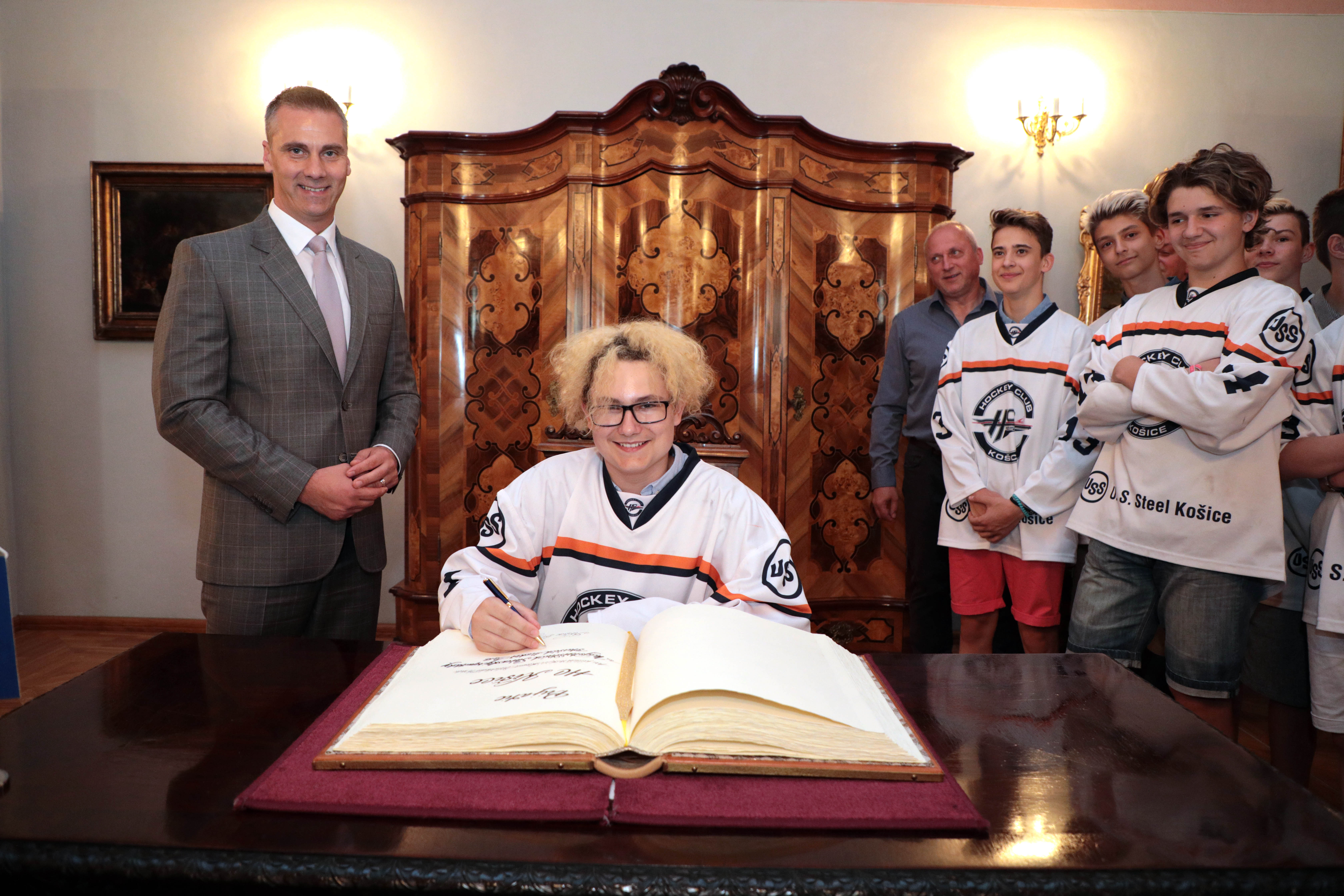 Našich starších žiakov, ktorí získali titul majstra Slovenska, dnes prijali predstavitelia mesta. Stalo sa tak na košickej radnici, kde ich privítal námestník primátora Martin Petruško, vedúci referátu športu a mládeže mestského magistrátu Ivan Šulek a vedúci kancelárie primátora a člen správnej rady HC Košice Martin Petruš.